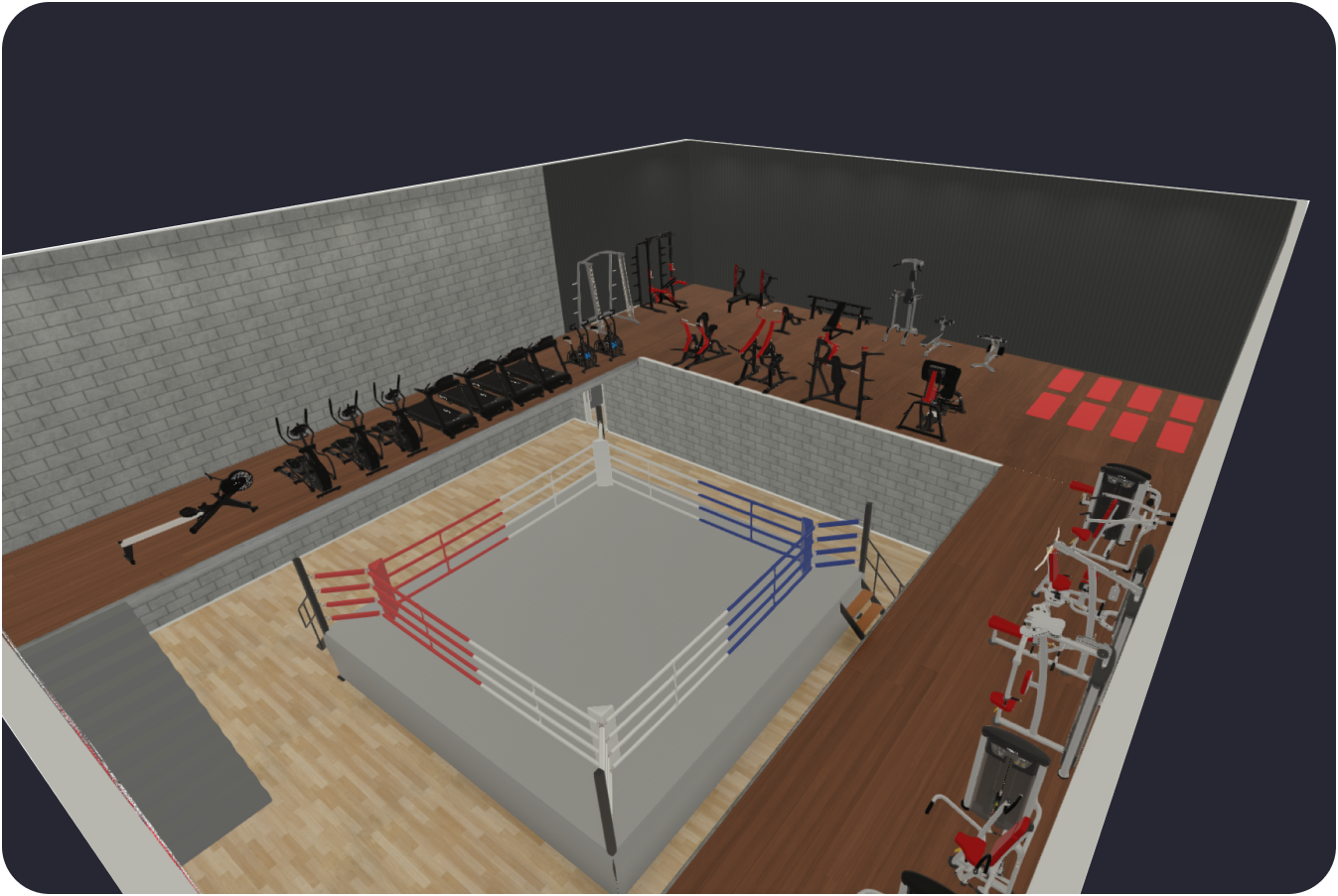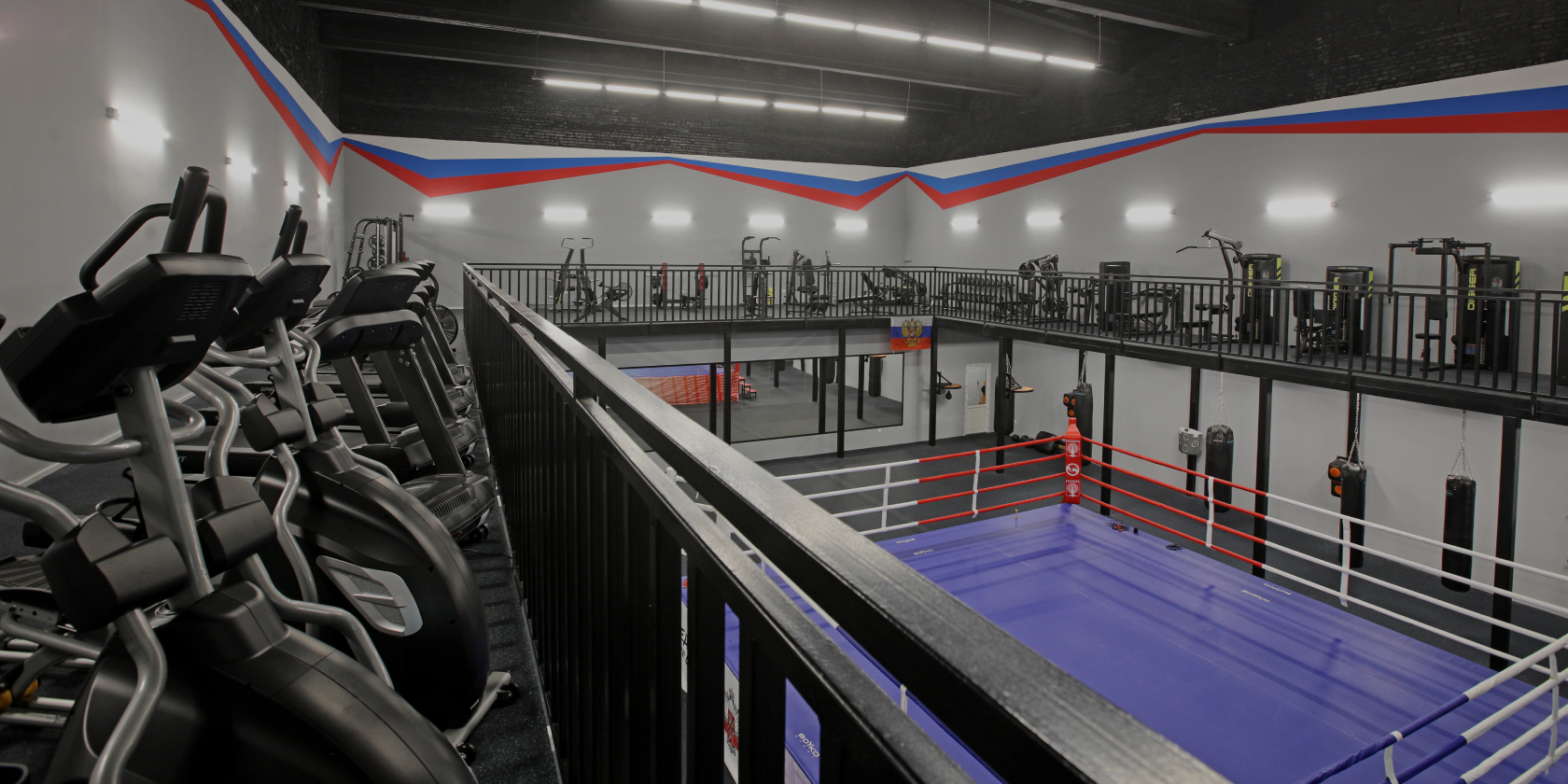 На первом этаже вписать ринг для спаррингов, зону для работы с мешками и грушами, и зону для разминки и заминки. Второй этаж предложили оборудовать уже спортивными тренажерами (кардио и силовое). Были сделаны дополнительные пролеты по двум сторонам помещения.