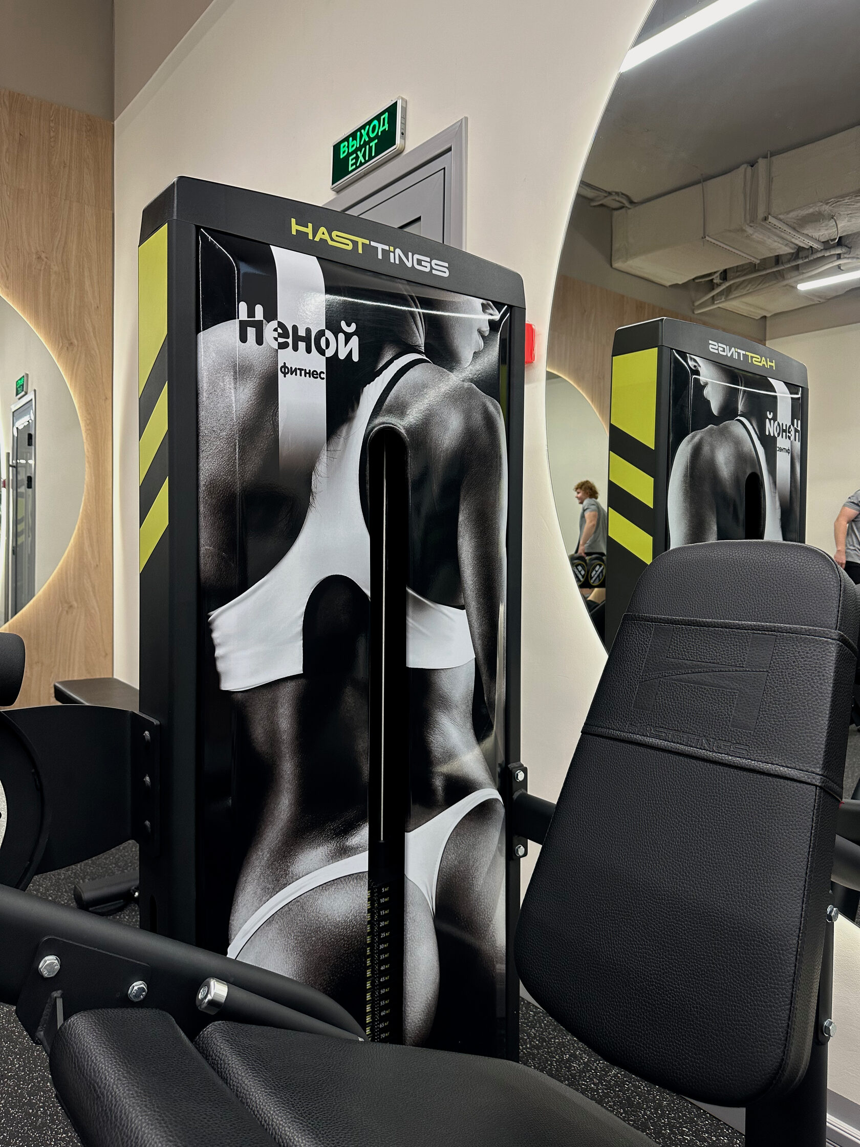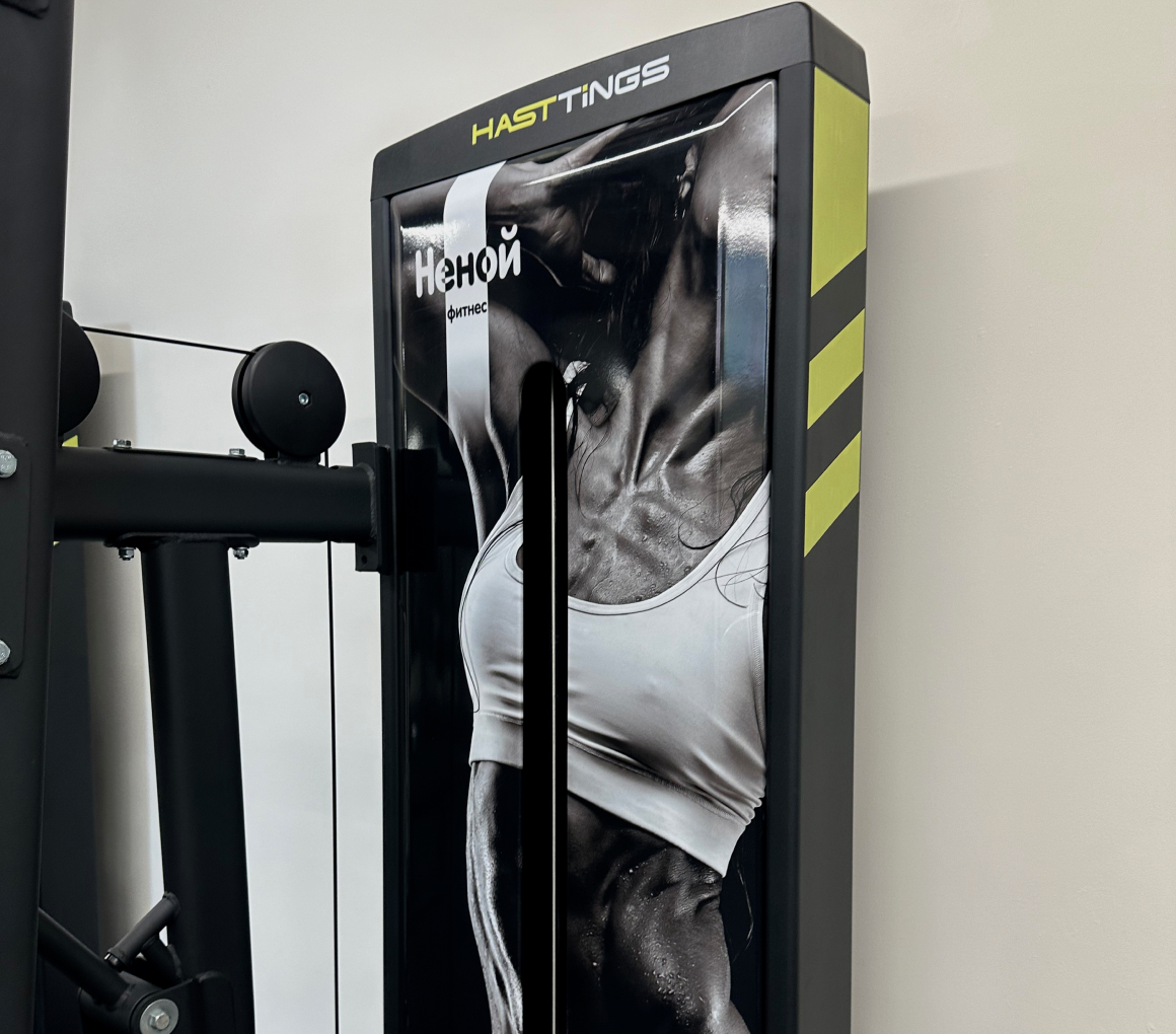 За 2 недели творческих поисков с нашим дизайнером был разработан вариант для грузоблочных тренажёров со спортивными девушками.