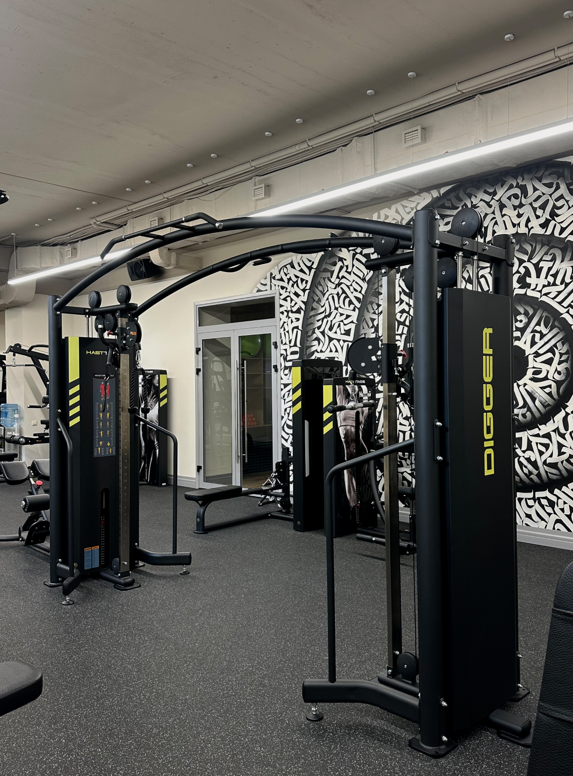 Зону силового тренинга оформили серией грузоблочных тренажеров 2в1 от бренда Hasttings Digger. Несмотря на то что тренажёры мультифункциональные, они совершенно не проигрывают по биомеханике тренажёрам с моно движением.