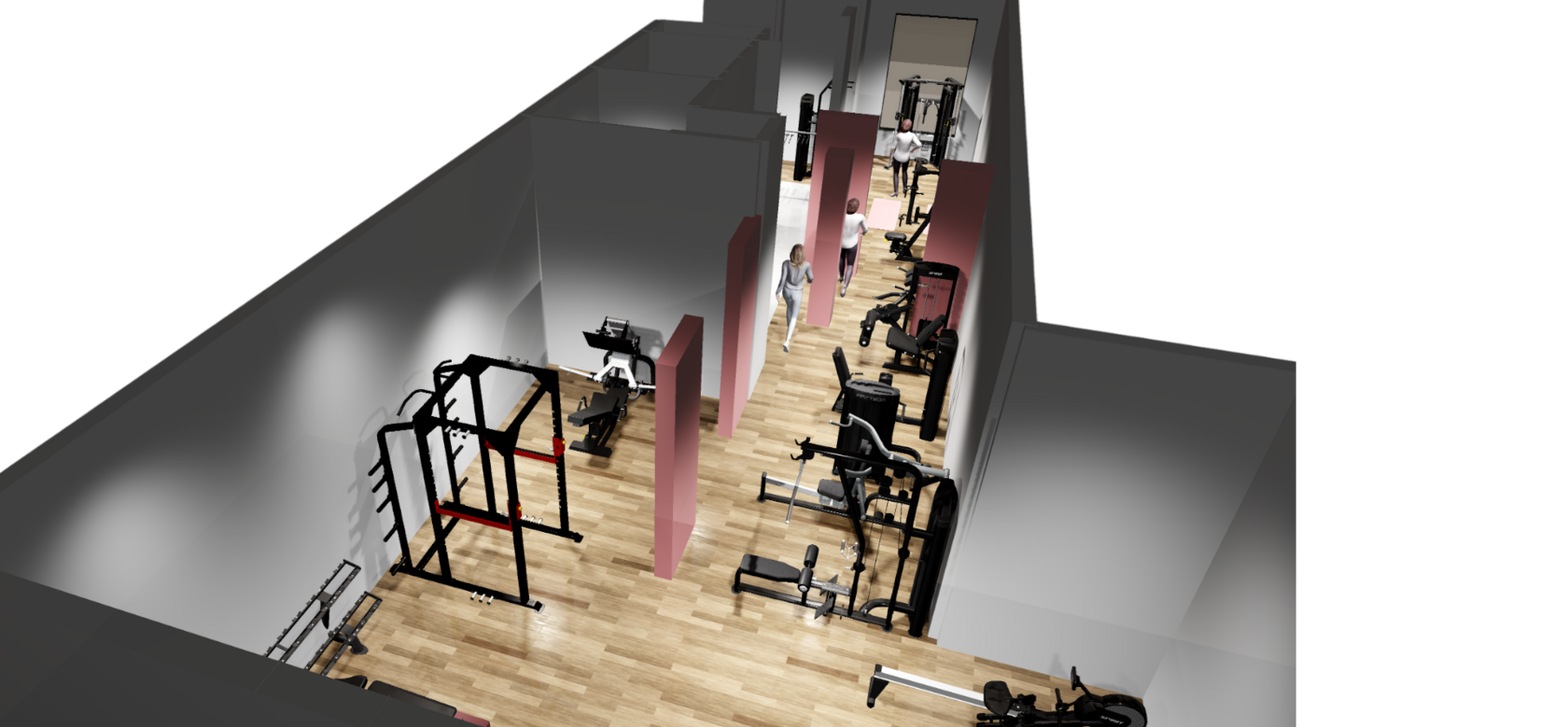 Начав процесс 3D-планирования помещения, мы столкнулись с необходимостью многократно менять расположение зон оборудования. Из предложенных 5 вариантов нужно было найти оптимальное решение, позволяющее выполнять упражнения эффективно, не мешая другим посетителям, и при этом соблюдая все принципы безопасной установки оборудования.